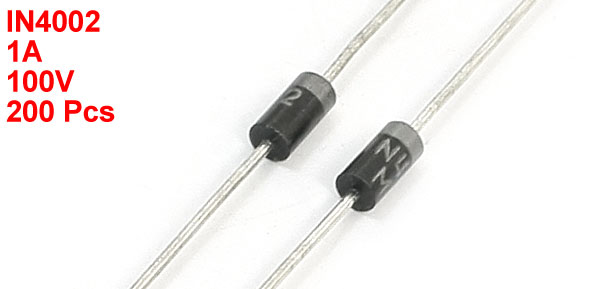 Product Name Rectifier Diode Model IN4002 Forward Current 1A Max Peak Reverse Voltage 100V Lead Size 0.7 x 27mm/ 0.01" x 1"(D*L) Body Size 2.5 x 5mm/ 0.1" x 0.2" (D*L) Main Color Black, Silver Tone Weight 47g Package Content 200 Pcs(±2%) x Rectifier Diodes - Reviews