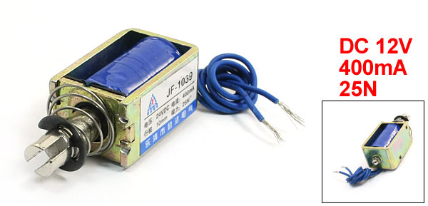 Details25N Spring Plunger Push Pull Type Electromagnet Solenoid DC 24V 400mA JF-1039  Product Name DC Solenoid Electromagnet Model JF-1039 Rated Voltage & Current DC 12V 400mA Action Form Push Pull Type Force 25N Stroke 8.5mm/0.33" Route 10mm/0.4" Body Size 39 x 26 x 20mm/1.6" x 1" x 0.8"(L*W*H) Cable Length 20cm/7.8" Material Metal, Electronic Parts Weight 72g Package Content 1 x DC Solenoid Electromagnet