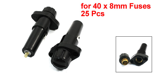 Item Name Panel Mounted Fuse Holder Fit for 40 x 8mm Fuses Material Plastic ,Metal Rated Voltage AC 10A 110-380V Color Black, Silver Tone Size 60 x 30mm/ 2.4" x 1.2" (L*D) Panel Cut Dia 11mm/0.43" Net Weight 310g Package Content 25 x Panel Mount Fuse Holder - Reviews
