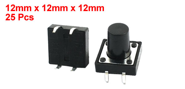 Product Name Tact Switch Action Type Momentary Total Size(Pin No Include) 12 x 12 x 12mm/0.47" x 0.47" x 0.47"(L*W*T) Button Size 7 x 9mm/0.28" x 0.35"(D*H) Mount Type DIP Material Plastic, Metal Color Black, Silver Tone Net Weight 25g Package Content 25 Pcs x Tact Switch - Reviews