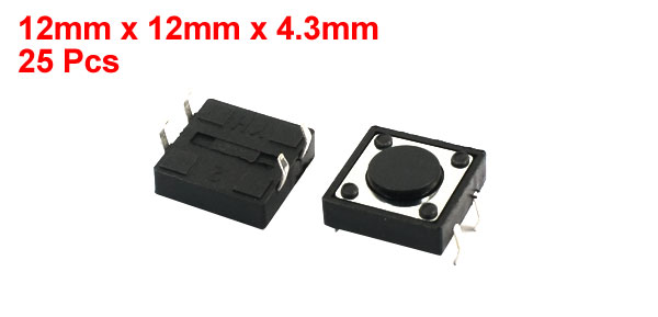 Product Name Tact Switch Action Type Momentary Total Size(Pin No Include) 12 x 12 x 4.3mm/0.47" x 0.47" x 0.17"(L*W*T) Button Size 7 x 1.3mm/0.28" x 0.05"(D*H) Mount Type DIP Material Plastic, Metal Color Black, Silver Tone Net Weight 21g Package Content 25 Pcs x Tact Switch - Reviews