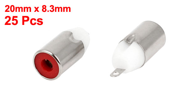 Main Color Silver Tone, Red, White Net Weight 27g Total Length 20mm/ 0.8" Country of Manufacture CHINA Package Content 25pcs x RCA Female Connectors Diameter(Approx) 8.3 x 3.3mm/ 0.33" x 0.13"(Outer D*Inner D) Material Metal, Plastic - Reviews