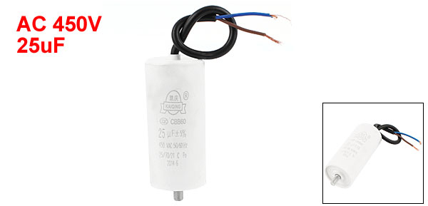 Product Name Motor Run Capacitor Model CBB60 Rated Capacitance 25uF Tolerance ±5% Rated Voltage AC 450V Frequency 50/60Hz Out Thread Size 15 x 8mm/0.59" x 0.31"(L*D) Body Size 98 x 45mm / 2.8" x 1.3"(H*D) Wire Length 22cm / 8.7" Main Material Polypropylene Film, Plastic Main Color White Weight 156g Package Content 1 x Motor Run Capacitor - Reviews