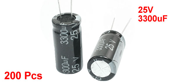 Capacitance 3300uF(±20%) Body Size 25mm x 13mm/ 1" x 0.51"(H*D) Lead Space 4mm Lead Length 27mm, 22mm Main Color Black Total Weight 976g Package Content 200Pcs(±2%) x Electrolytic Capacitors - Reviews