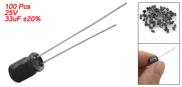 Details25V 33uF Aluminum Electrolytic Capacitors 5x7mm (Bag of 100)  Product Name Aluminum Electrolytic Capacitor Type Radial Lead Maximum Temperature 105°C Voltage 25V Capacitance 33uF Capacitance Tolerance ±20% Body Size 5 x 7mm/0.2'' x 0.28'' (D*L) Lead Spacing 2mm/0.08'' Lead Length 25mm/1'', 20mm/ 0.79'' External Material Aluminum Weight 29g Color As Picture Shown Package Content 100 Pcs (±2%) x Electrolytic Capacitors