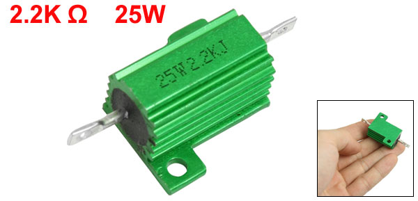 Product Name Aluminum Resistor Resistance Value 2.2K Ω Power Rating 25W Resistance Tolerance ± 5% (J) Body Size 26 x 15mm/1" x 0.6" (L*D) Mounted Hole Size 1.8mm/ 0.07", 3.3mm/ 0.13" Total Size 50 x 27 x 15mm/2" x 1.1" x 0.6" (L*W*T) Casing Material Aluminum Color Green Weight 13g Package Content 1 x Aluminum Resistor - Reviews