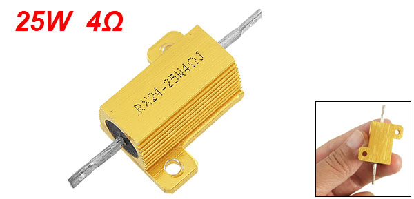 Product Name Aluminum Housed Resistor Resistance Value 4Ω Power Rating 25W Resistance Tolerance ± 5% (J) Body Size 28 x 15mm/ 1.1" x 0.59" (L*D) Mounted Hole Size 1.5mm/ 0.06", 3mm/ 0.12" Total Size 55 x 31 x 15mm/ 2.2" x 1.2" x 0.59" (L*W*T) Casing Material Aluminum Color Gold Tone Weight 14g Package Content 1 x Aluminum Housed Resistor - Reviews