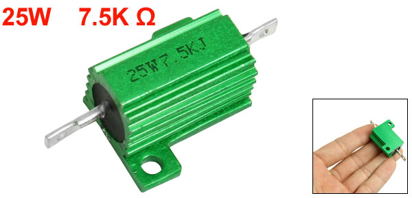 Product Name Aluminum Resistor Resistance Value 7.5K Ω Power Rating 25W Resistance Tolerance ± 5% (J) Body Size 26 x 15mm/1" x 0.6" (L*D) Mounted Hole Size 1.5mm/0.06", 2.5mm/0.1" Total Size 50 x 27 x 15mm/2" x 1.1" x 0.6" (L*W*T) Casing Material Aluminum Color Green Weight 13g Package Content 1 x Aluminum Resistor - Reviews