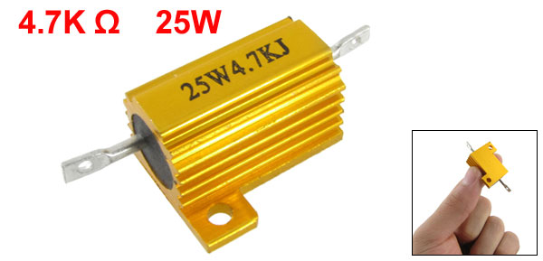 Product Name Aluminum Resistor Resistance Value 4.7K Ω Power Rating 25W Resistance Tolerance ± 5% (J) Body Size 2.6 x 1.5cm / 1." x 0.6" (L*D) Total Size 5.5 x 2cm/ 2.1" x 0.78" (L*W) External Material Aluminum Color Gold Tone Net Weight 14g Package Content 1 x Aluminum Resistors - Reviews
