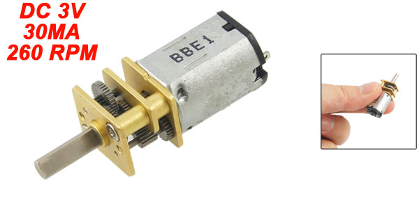 Product Name DC Geared Motor Rated Voltage DC 3V Rated Current 30MA ( no load ) Speed 260 RPM Shaft Diameter 3mm/ 0.118" Gearbox Size 15 x 12 x 10mm/ 0.59" x 0.47" x 0.39"(L*W*T) Overall Size 36 x 12 x 10mm/ 1.4" x 0.47" x 0.39"(L*W*T) Main Color Gray, Brass Tone Material Metal Weight 10g Package 1 x DC Geared Motor - Reviews