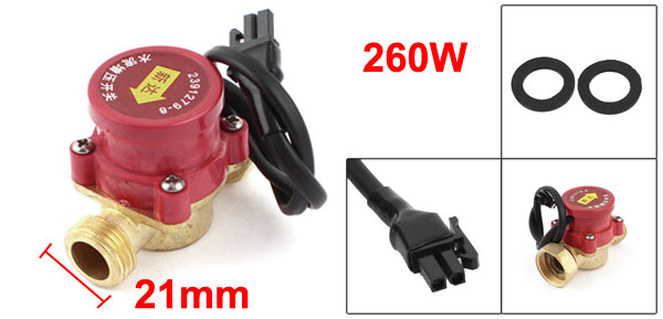 Product Name Water Flow Sensor Switch Fit Pump Power 260W Water Temperature Range 1 - 100 Degree Celsius Female Port Thread Dia 26mm / 3/4PT Male Thread(Fit Pipe Dia) 21mm/1/2PT Body Size(Approx.) 65 x 38 x 50mm / 2.6" x 1.5" x 2.0"(L*W*H) Cable Length 27.5cm / 10.8" Material Metal Color Copper Tone, Red Weight 132g Package Content 1 x Water Flow Sensor Switch - Reviews
