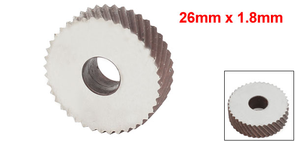 Product Name Knurling Wheel Design Diagonal Coarse Pitch 1.8mm / 0.071" Wheel Size 26 x 8 x 8mm / 1.02" x 0.31" x 0.31" (OD*Inner Dia.*Thickness) Material HSS Weight 28g Package Content 1 x Knurling Wheel - Reviews