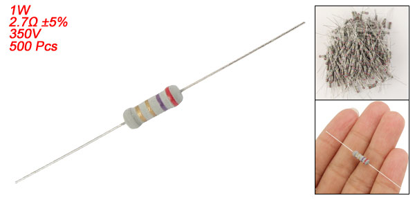 Product Name Carbon Film Resistor Material Type Carbon Film Rated Power 1W Resistance Value 2.7 ohm Tolerance ±5% Withstand Voltage 350V Body Size 10.6 x 3.6mm / 0.417" x 0.142" (L * D) Lead Size (Each End) 23 x 0.4mm/0.9" x 0.016" (L*Dia.) Color As Picture Shown Weight 158g Package Content 500 Pcs(±2%) x Carbon Film Resistors - Reviews