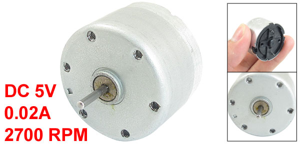 Product Name DC Motor Rated Voltage DC 5V Rated Current 0.02A Speed 2700 RPM Mounting Screw Hole Diameter 2.3mm/0.09" Shaft Size 2 x 10mm/ 0.08" x 0.4"(D*L) Body Size 20 x 31mm/ 0.8" x 1.2" (H*D) Main Color Silver Tone External Material Metal, Plastic Net Weight 50g Package 1 x DC Motor - Reviews