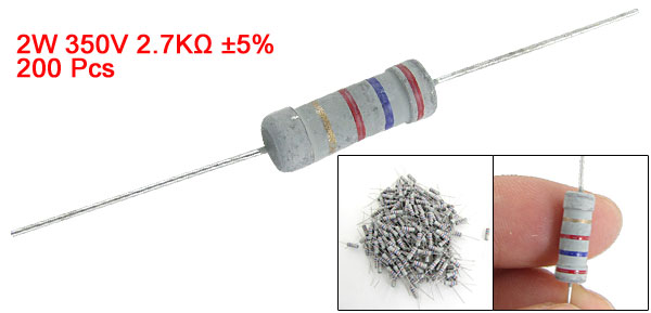 Product Name Carbon Film Resistors Material Type Carbon Film Rated Power 2W Resistance Value 2.7KΩ Tolerance ±5% Withstand Voltage 350V Total Size 60 x 5mm / 2.36" x 0.196" (L * D) Lead Diameter 0.4mm / 0.0157" Color As Picture Shown Weight 170g Package Content 200 Pcs (± 2%) x Carbon Film Resistors - Reviews
