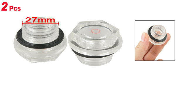 Product Name Oil Level Sight Glass Material Plastic Color Clear, Black, Red Thread Diameter 27mm/ 1" Overall Size 38 x 23mm/ 1.5" x 0.9" (D*T) Net Weight 21g Package Content 2 x Oil Level Sight Glass - Reviews