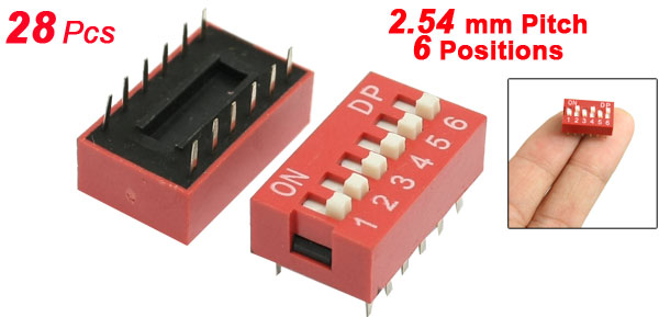 Product Name DIP Switch Type 6 Position Slide Type Poles 2 x 6 Pins(2 rows) Pitch 2.54mm Non-Switching Rating 100mA DC 50V Switching Rating 25mA DC 24V Dimension 1.5 x 1 x 1cm/ 0.6" x 0.4" x 0.4"(L*W*H) Material Plastic, Electric Parts Main Color Red Weight 44g Package Content 28 Pcs x DIP Switches - Reviews