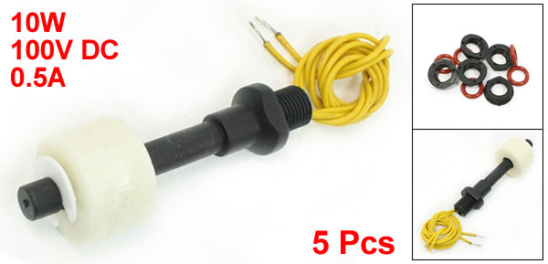 Product Name Floating Switch Model No. ZP6210 Max Contact Rating 10W Max Switching Voltage 100V DC Max Switching Current 0.5A Max Breakdown Voltage 220V DC/AC Max Carry Current 1A Max Contact Resistance 100mΩ Temperature Rating -10 / +85 °C Float Ball Material P.P Float Body Material P.P Thread Dia(Approx) 9.5mm / 0.374" Switch Body Size 23.3 x 73mm / 0.9" x 2.9"(Max D*H) Cable Length 36cm / 14.2" Color Black, off White Net Weight 66g Package Content 5 x Floating Switch - Reviews