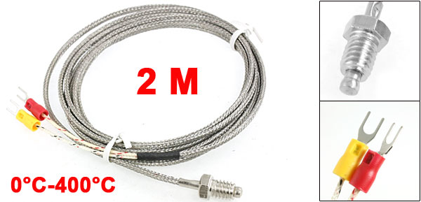 Product Name Thermocouple Probe Type K Type Fork Pin Number 2 Temperature Range 0°C-400°C Sensor Size 4 x 25mm/ 0.16" x 1" (D*L) Fork Pin Size 9 x 5mm/ 0.4" x 0.2"(L*W) Pin Spacing 4mm/ 0.2" Thread Diameter 8mm/ 5/16" External Shield Material Metal Total Length(Approx.) 2M / 6.6 Ft Color Silver Tone Weight 31g Package Content 1 x Earth Thermocouple Probe - Reviews