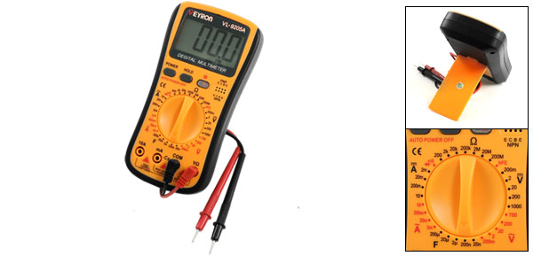 Product Name Digital Multitester Model VL-9205A DC Voltage 200mV-2000mV-20V-200V-1000V AC Voltage 200mV-2V-20V-200V-750V DC Current 2mA-20mA-200mA-10A AC Current 2mA-20mA-200mA-10A Resistance(Ohm) 200-2K-20K-200K-2M-20M-200M Capacitance 20nF, 200nF, 2uF, 20uF, 200uF Other Measuring Function Diode, hFE, Buzzer Battery Powered 9V(6F22) (Not included) Main Color Yellow, Black Mateiral Plastic, Electronic Parts Cable Length 65cm / 2.1 Ft Body Size 16.8 x 8.3 x 3.5cm / 6.6" x 3.3" x 1.4"(L*W*T) Net Weight 366g Package Content 1 x Multitester