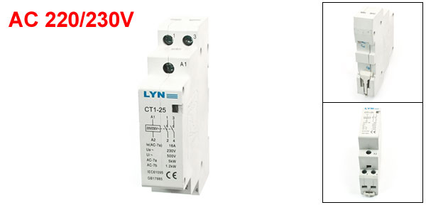 Product Name AC Contactor Model No. CT1-25 Rated Coil Voltage AC 220/230V Rated Current(AC-7a) 25A Contact Type 2NO Number of Poles 2 (AC-7a)Le 16A Ue 230VAC Ui 500VAC AC-7a 5kW AC-7b 1.2kW Mounting Type 35mm DIN Rail Overall Size(Approx.) 85 x 65 x 18mm / 3.3" x 2.6" x 0.7"(L*W*T) Material Plastic, Electronic Parts Net Weight 129g Package Content 1 x AC Contactor - Reviews