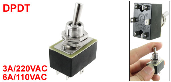 Details2P2T ON-ON 2 Position Toggle Switch 3A/220VAC 6A/110VAC  Product Name Toggle Switch Type DPDT (ON/ON) Position 2 Mounting Hole Diamter 11.6mm / 0.456" Voltage & Current 3A/220VAC 6A/110VAC Main Body Size 28.2 x 18.4 x 15.2mm / 1.1" x 0.7" x 0.6"(L*W*H) Overall Height 46.5mm / 1.8" Material Metal & Resin Color Black Weight 22g Package Content 1 x Toggle Switch