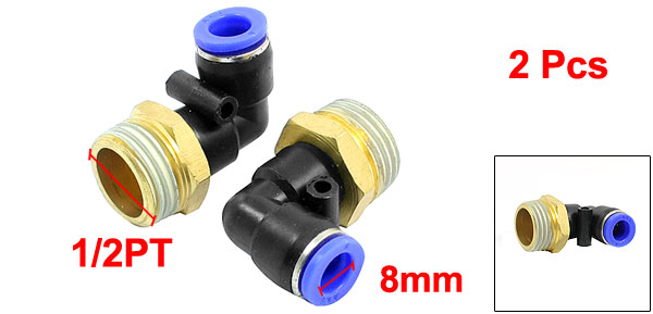 Product Name Quick Fittings Design Male Thread L Shaped Connect Type Male Thread 1/2PT Fit Tube Outside Dia 8mm/0.31" Material Plastic, Brass Dimension (Approx) 38 x 33 x 24mm/ 1.5" x 1.3" x 0.94" (L*W*H) Color Brass Tone, Blue, Black Net Weight 54g Package Content 2 x Quick Fittings - Reviews