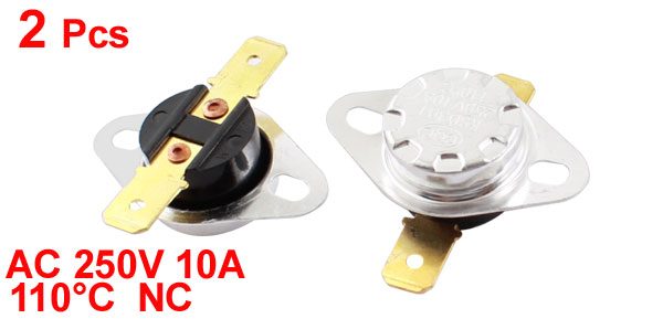 Product Name Temperature Control Switch Thermostat Model.No KSD301 Action Type NC Action Temperature 110°C Voltage AC 250V 10A Total Size(Each) 3.3 x 3.2 x 1.2cm/1.3" x 1.3" x 0.5"(L*W*T) Mounting Hole Size 5 x 3mm/0.2" x 0.12"(L*W) Mounting Hole Distance 2.3cm/0.9" (Center to Center) Material Metal, Plastic Color Black, Silver Tone Net Weight 9g Package Content 2 x Temperature Control Switch Thermostat - Reviews