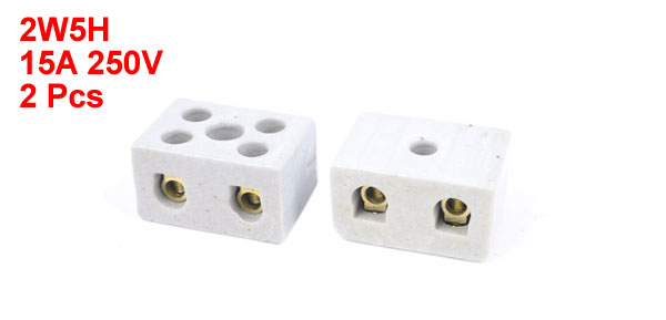 Product Name Ceramic Terminal Block Type 2W5H Rating Current 15A Rating Voltage 250V Total Size 3.2 x 2.3 x 1.8cm/1.3" x 0.9" x 0.7"(L*W*T) Screw Mounting Hole Dia 6mm/0.24" Materials Ceramic, Bronze Main Color White Net Weight 59g Package Content 2 x Ceramic Terminal Blocks - Reviews