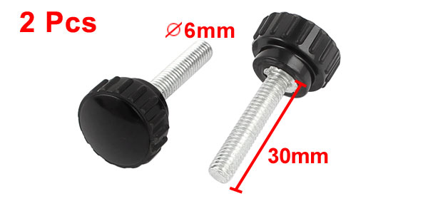 Product Name Straight Knurled Knob Type Screw On Head Diameter 21mm / 0.83" Thread Size 6 x 30mm / 0.24" x 1.2"(D*L) Total Height 43mm / 1.5" Material Metal, Plastic Color Silver Tone, Black Total Weight 26g Package Content 2pcs x Straight Knurled Knob - Reviews