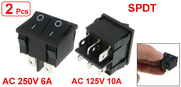 Product Name Rocker Switch Poles SPDT Terminals 6 Pin (On-On) Rating Voltage AC 250V 6A AC 125V 10A Total Size(Each One) 2.4 x 2 x 2.5cm/0.9" x 0.78" x 0.98"(L*W*H) Mounting Size 2.1 x 1.8 x 2cm/0.8" x 0.7" x 0.78"(L*W*H) Color Black Material Plastic, Metal Total Weight 17g Package Content 2 x Rocker Switch - Reviews