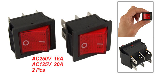Item Name Rocker Switch Type On/ On (DPDT) Voltage & Current AC250V, 16A AC125V, 20A Overall Size ~3.3 x 2.5 x 3.5 cm / 1.3" x 0.98" x 1.4"(L*W*H) Mount Hole Size 2.9 x 2.1cm / 1.14" x 0.83"(L*W) Color Red & Black Material Plastic & Metal Total Net Weight 24g Package Content 2 x Rocker Switch - Reviews