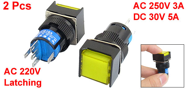 Details2Pcs AC 220V Lamp 5P SPDT Yellow Square Cap Latching Push Button Switch  Item Name Push Button Switch Contact Type 1NO, 1NC (SPDT) Action Type Latching Type Switch Working Voltage AC 250V 3A DC 30V 5A Lamp Voltage AC 220V Cap Color Yellow Switch Color Black, Yellow Pin Number 5 Button Size 15 x 15mm/ 0.59" x 0.59" (L*W) Mounting Plate Thickness 8mm/ 0.31" Mounting Thread Dia. 16mm/ 0.63" Total Size 18 x 18 x 40mm/ 0.7" x 0.7" x 1.6"(L*W*H) Material Plastic, Electronic Parts Weight 15g Package Content 2 x Push Button Switch