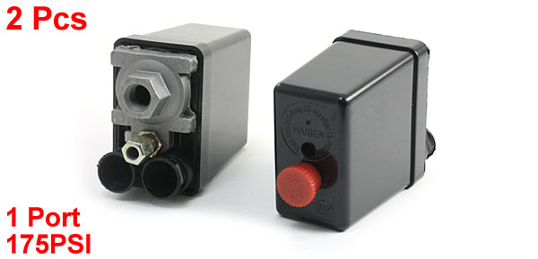 Details2Pcs AC 240V 1/4PT Female Thread 12Bar 1 Port 2NC Air Compressor Pressure Switch  Product Name Air Compressor Pressure Switch Type 1 Port, 1 Phase, 2NC Pressure 175PSI/12 Bar Max. Voltage AC 240V Current 20A Female Thread Size 1/4PT Female Thread Dia. 12mm Total Size 12.5 x 8 x 5cm/4.9" x 3.15" x 2"(L*W*T) Material Metal, Plastic Main Color Black, Red, Gray Weight 363g Package Content 2Pcs x Air Compressor Pressure Switch
