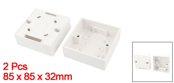Product Name Pattress Back Box Mounted Type Surface Type Power AC 250V 10A Installing Thread Hole Diameter 3.5mm/ 0.1" Installing Thread Hole Center Distance 62mm/ 2.4" Total Size 85 x 85 x 32mm/ 3.3" x 3.3" x 1.3""(L*W*H) Material PVC Color White Net Weight 112g Package 2 x Pattress Back Box - Reviews