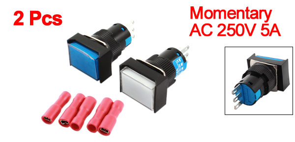 Item Name Rectangle Head Push Button Switch w Crimp Connector Model LA160-16A Contact Type SPDT(1NO 1NC) Action Type Momentary Pin Number 3 Voltage, Current AC 250V 5A Thread Dia 16mm/0.63" Total Size(Not Included Pin) 31 x 24 x 17mm /1.2" x 0.9" x 0.67" (L *W *H) External Color Red, White, Blue, Black Material Plastic, Metal Net Weight 19g Package Content 2 x Rectangle Head Push Button Switch