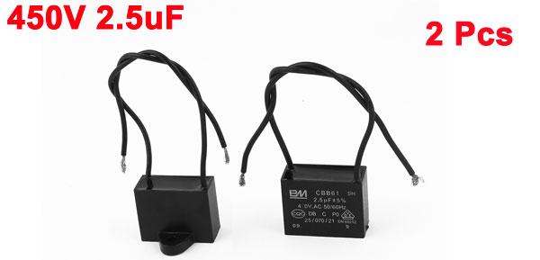 Terminal Wired Rated Capacitance 2.5uF Tolerance ± 5% Rated Frequency 50/60Hz Rated Voltage AC 450V Body Size 36 x 28 x 16mm / 1.4" x 1.1" x 0.63" (L*W*H) Wire Length 15cm / 6" Install Bore Diameter 5mm / 0.2" Main Color Black Weight 46g Package Content 2 x Motor Run Capacitor - Reviews