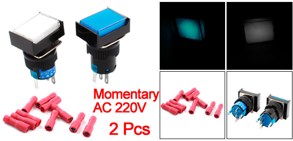 DC 30V 5ALight Voltage AC 220V Thread Dia 16mm/0.63" Total Size(Not Included Pin) 31 x 24 x 17mm /1.2" x 0.9" x 0.67" (L *W *H) Light Color Blue, White External Color Red, Blue, White, Black Material Plastic, Metal Net Weight 22g Package Content 2 x Rectangle Head Push Button Switch