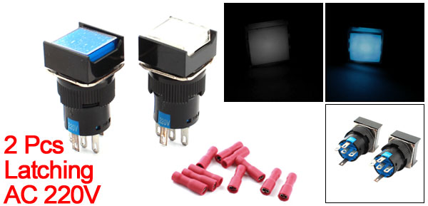 Item Name Push Button Switch Action Type Latching Type Head Shape Rectangle Head Contact SPDT Switch Rating AC 250V 3A, DC30V 5A Lamp Voltage AC 220V Light Color White, Blue Pin Number 5 Thread Diameter 16mm/0.63" Total Size 18.5 x 18.5 x 32mm/0.73" x 0.73" x 1.3"(L*W*T) Material Metal, Plastic, Electric Parts Main Color Blue,Black Net Weight 21g Package Content 2 x Push Button Switch