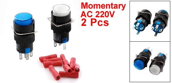 2PCS AC220V White Blue Lamp Panel SPDT Momentary Pushbutton Switch w Connectors
