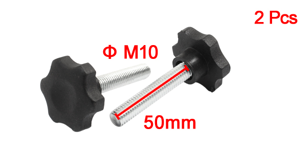 Product Name Clamping Knob Thread Hole Inner Dia. M10 Thread Length 50mm/ 2" Star Head Diameter 40mm/ 1.6" Total Height 70mm/ 2.75" Material Metal, Plastic Color Black, Silver Tone Weight 89g Package Content 2 Pcs x Clamping Knob - Reviews