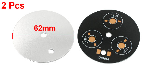 Product Name LED Aluminum PCB Circuit Board Fit for 3pcs x 1W/3W/5W LED(Series) Diameter 62mm/ 2.4" Thickness 1.5mm/0.06" Net Weight 22g Materials Aluminum Main Color Black, Silver Tone Package Content 2 x LED Aluminum PCB Circuit Boards - Reviews