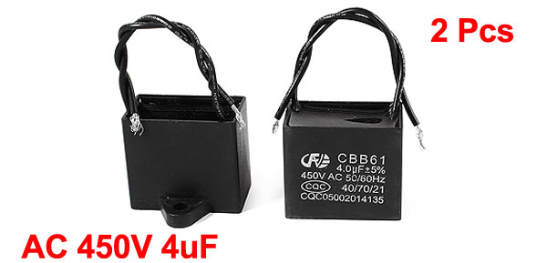 Product Name Motor Capacitor Model CBB61 External Material Plastic Dielectric Material Metalized Polypropylene Film Rated Capacitance 4uF Tolerance ±5% Rated Frequency 50/60Hz Rated Voltage AC 450V Body Size 40 x 22 x 34mm/ 1.6" x 0.87" x 1.3"(L*W*T) Fixing Hole Diameter 5mm/0.2" Cable Length 10cm/ 3.9" Net Weight 67g Package Content 2 x Motor Run Capacitor - Reviews