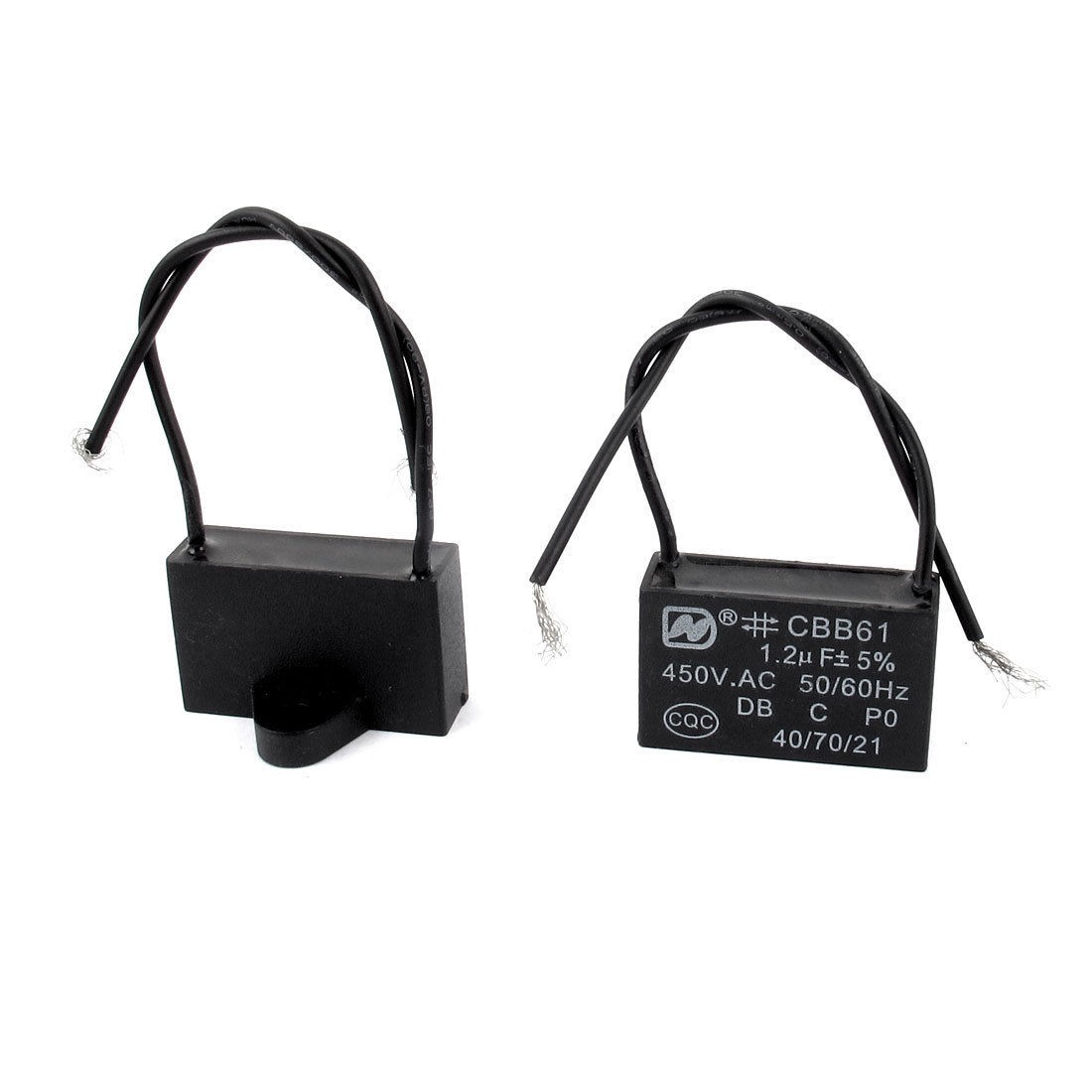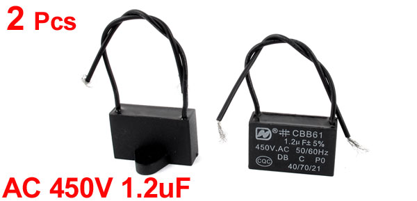Product Name Motor Capacitor Model CBB61 External Material Plastic Dielectric Material Metalized Polypropylene Film Rated Capacitance 1.2uF Tolerance +/-5% Frequency 50/60Hz Rated Voltage AC 450V Body Size 36 x 22 x 12mm/ 1.4" x 0.87" x 0.5"(L*W*T) Mount Hole Diameter 4mm/0.16" Cable Length 10cm/ 4" Net Weight 27g Package Content 2 x Motor Capacitor - Reviews