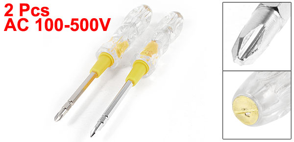 Product Name Electroprobe Screwdriver Voltage AC100-500V Head Diameter 4mm/ 0.2" Overall Size 17 x 2cmm / 6.7" x 0.8"(L*W) Material Plastic, Metal Color Clear, Yellow, Silver Tone Weight 81g Package Included 2 x Electroprobe Screwdriver - Reviews