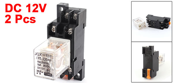 Pins 8-Pin Net Weight 158g Socket Mount Rail Type 35mm DIN Rail Mount Action Type DPDT 2NO 2NC Country of Manufacture CHINA Model JQX-13F Package Content 2Pcs x Power Coil Relay w Socket Relay Size 27 x 21 x 34mm/1" x 0.83" x 1.3"(L*W*H) Contact AC 250V/DC 28V 10A Material Plastic, Metal Socket Size 77 x 31 x 22mm/3" x 1.2" x 0.87"(L*W*H) Coil Voltage DC 12V - Reviews