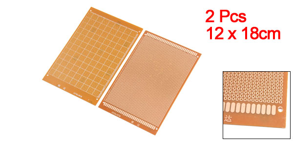 Product Name Universal PCB Board Design Single Side Hole Dia(Approx) 0.1mm / 0.039" Hole Pitch(Approx) 2.54mm / 0.1" Size(Approx) 12 x 18cm /4.7" x 7.1"(W*L) Thickness(Approx) 1.5mm / 0.06“ Install Hole Dia 3mm/0.12" Install Hole Distance 16 x 11.2cm/6.3" x 4.4"(L*W) Material Copper PCB Color Copper Tone Weight 65g Package Content 2 x Universal PCB Board - Reviews