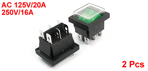 Product Name Waterproof Rocker Switch Connection Type DPDT(I/O) Position On-Off Terminals Number 6 Voltage/Current AC 125V/20A 250V/16A Total Size(Each) 35 x 29 x 36mm/ 1.4" x 1.1" x 1.4"(L*W*H) Mounted Size 30 x 21mm/ 1.2" x 0.83"(L*W) Switch Color Black, Green Button Color Green Material Plastic, Metal Weight 33g Package Content 2 x Waterproof Rocker Switches - Reviews