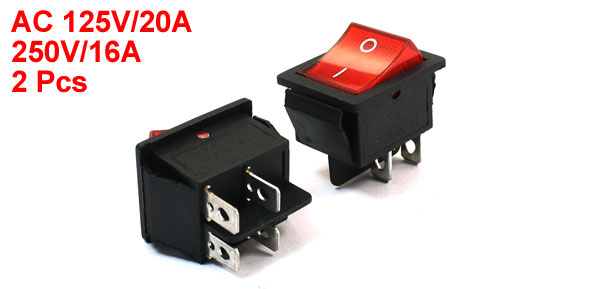 Product Name Rocker Switch Connection Type DPST Position On-Off Terminals Number 4 Voltage/Current AC 125V/20A 250V/16A Total Size(Each) 33 x 25 x 35mm/ 1.3" x 1" x 1.4"(L*W*H) Mounted Size 29 x 21mm/ 1.1" x 0.83"(L*W) Switch Color Black, Red Button Color Red Material Plastic, Metal Weight 23g Package Content 2 x Rocker Switches - Reviews