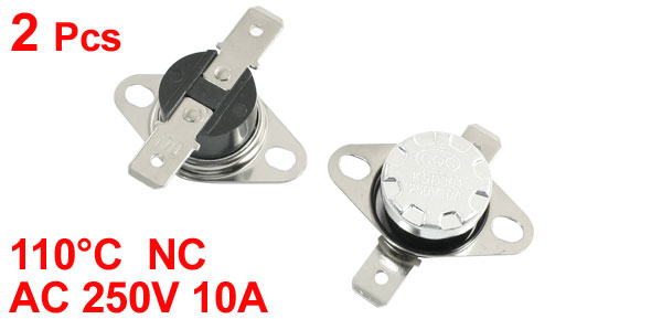 Product Name Temperature Control Switch Model.No KSD301 Action Type Normally Closed(NC) Action Temperature 110°C Voltage & Current AC 250V, 10A Total Size (Each) 34 x 18 x 12mm / 1.3" x 0.71" x 0.47"(L*W*H) Mounting Hole Size 4.5 x 3.5mm/0.18" x 0.14"(L*W) Material Metal, Plastic Color Black, Silver Tone Total Weight 10g Package Content 2 x Temperature Control Switches - Reviews